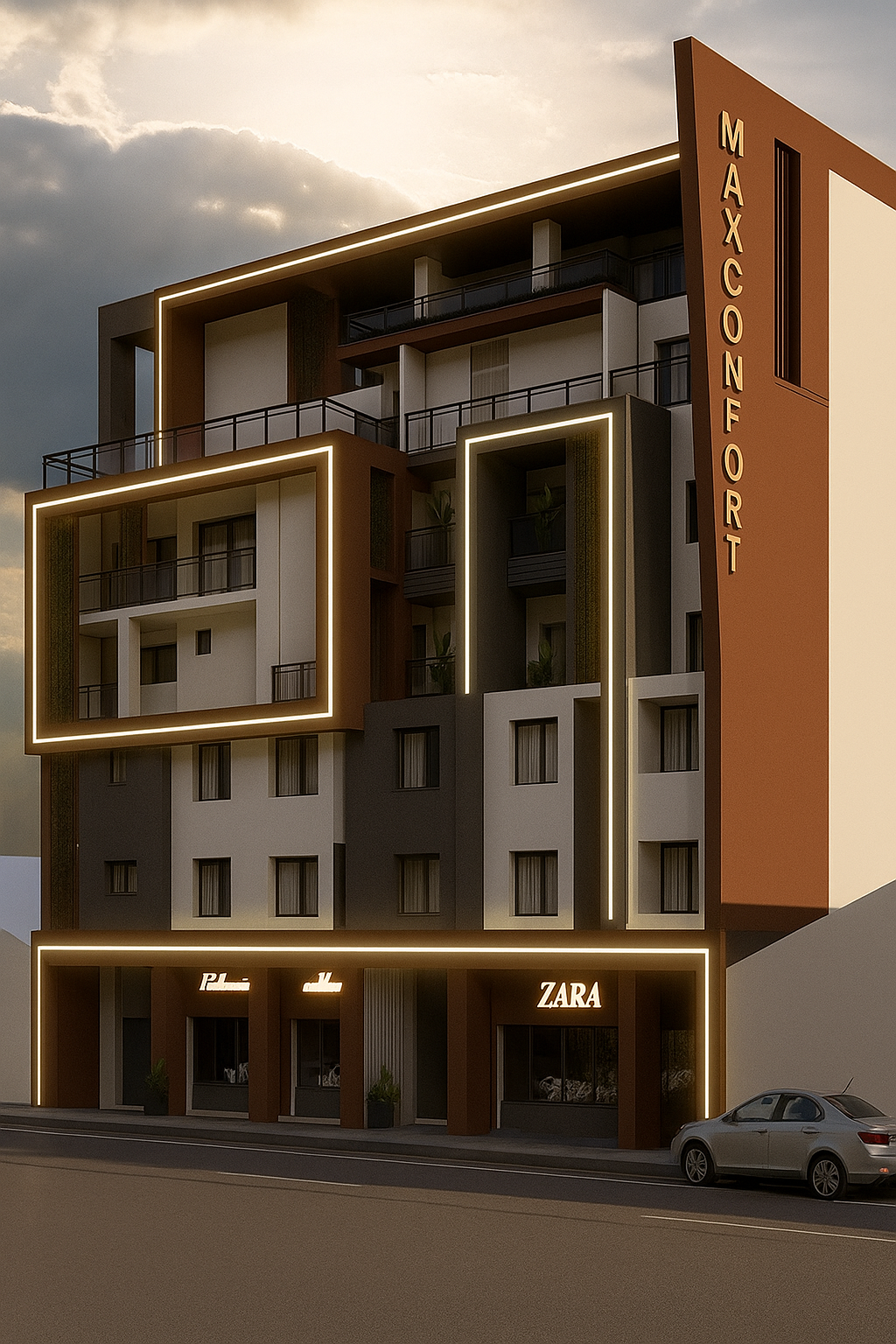 La Résidence Maxconfort est un projet immobilier mixte haut standing combinant espaces résidentiels, commerciaux et de services. Nous offrons une solution de vie complète avec des appartements modernes, des commerces et des services intégrés dans un environnement sécurisé et bien pensé.